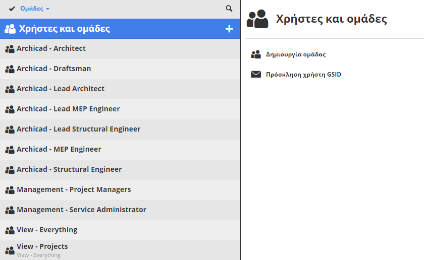 Ο BIMcloud Software as a Service έρχεται με προεπιλεγμένες Ομάδες Χρηστών, με προκαθορισμένους ρόλους και δικαιώματα. Συστήνεται η ένταξη χρηστών σε αυτές τις προεπιλεγμένες Ομάδες Χρηστών. Αυτές οι ομάδες, με τη σειρά τους, συνδέονται με ρόλους και συσχετισμένα σύνολα δικαιωμάτων.