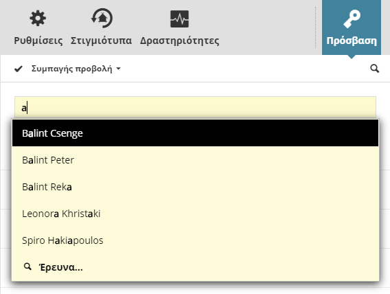 Ανοίξτε το πάνελ Πρόσβαση και αρχίστε να πληκτρολογείτε το όνομα εκείνου που μπορεί να το προσπελάσει, ή κάντε κλικ στην Έρευνα. Για την παραχώρηση πρόσβασης σε όλους τους χρήστες, χρησιμοποιήστε την ειδική ομάδα Όλοι.