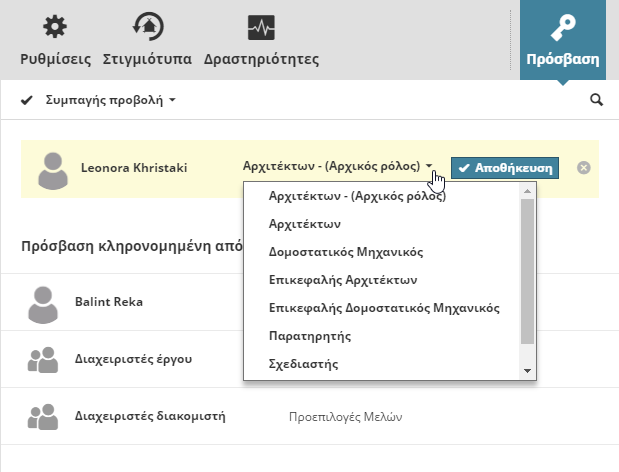 - Διαλέξτε έναν ρόλο για τον επιλεγμένο χρήστη ή την ομάδα. Αυτό καθορίζει τι ρόλο θα έχει για το επιλεγμένο στοιχείο. (Κάθε ρόλος είναι ένα σύνολο δικαιωμάτων. Ορίστε και επεξεργαστείτε ρόλους στη σελίδα Ρόλοι.) Μπορείτε: