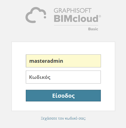 Το όνομα εισόδου του Γενικού Διαχειριστή είναι: masteradmin. Ο κωδικός ορίστηκε κατά την εγκατάσταση του server, στον διαμορφωτή BIMcloud Manager. Εάν έχετε ξεχάσει τον κωδικό, τότε τρέξτε πάλι τον Διαμορφωτή του BIMcloud Manager και ορίστε έναν νέο κωδικό.