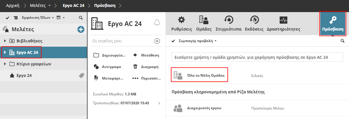 Εάν δεν απαιτείται τέτοια διαφοροποίηση ευθυνών μεταξύ των Κλάδων, ο διαχειριστής μπορεί να παραχωρήσει την ίδια πρόσβαση σε όλα τα μέλη όλων των Κλάδων μίας Μελέτης BIMcloud, διαλέγοντας την επιλογή ‘Όλα τα μέλη Κλάδου’.