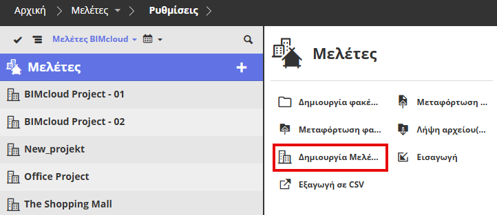 Από τη ρίζα Μελέτες ή οποιονδήποτε φάκελο της ιεραρχίας Μελέτες: πατήστε Δημιουργία Μελέτης BIMcloud.