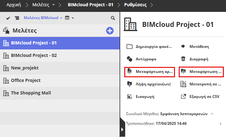 Από οποιοδήποτε επιλεγμένο στοιχείο στην ιεραρχία Μελέτες: πατήστε Μεταφόρτωση Αρχείου ή Μεταφόρτωση Φακέλου.