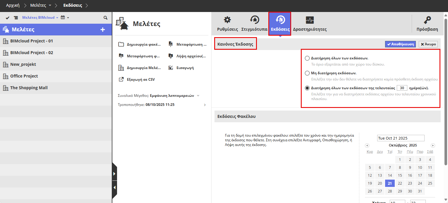 Διατήρηση όλων των εκδόσεων: Είναι η προκαθορισμένη: Όλες οι προηγούμενες εκδόσεις διατηρούνται επ' αόριστον, εφόσον το επιτρέπει ο χώρος.