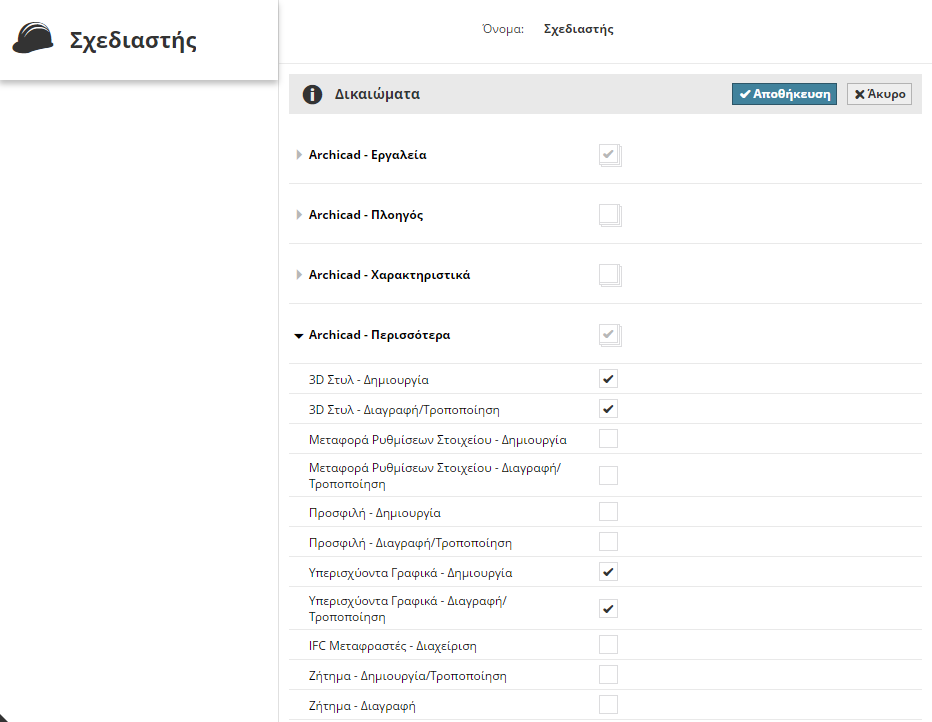 Τα δικαιώματα ρόλων χωρίζονται σε έξι ομάδες δικαιωμάτων που σχετίζονται με το Archicad, καθώς και σε μία ομάδα δικαιωμάτων Διαχείρισης. Πατήστε τις επικεφαλίδες κατηγοριών για διεύρυνση/ελαχιστοποίηση της λίστας τους.