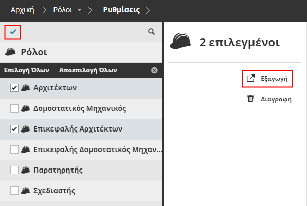 - Επιλέξτε τον Ρόλο(ους) που θέλετε να εξάγετε.Σημείωση: Για πολλαπλή επιλογή στοιχείων στον Πλοηγό, ενεργοποιήστε τα κουτάκια τσεκαρίσματος με κλικ στο σημάδι τσεκαρίσματος που είναι στο άνω μέρος της σελίδας