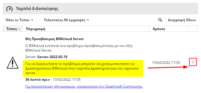 Για οποιοδήποτε στοιχείο, κάντε κλικ στο βέλος για να ανοίξετε αυτόματα τη σελίδα του BIMcloud Manager ή άλλης τοποθεσίας, όπου μπορείτε να προβάλετε ή να διορθώσετε το πρόβλημα, κατά περίπτωση.