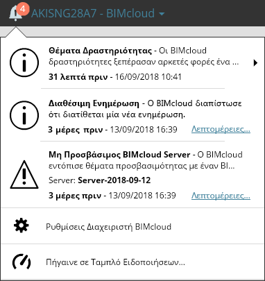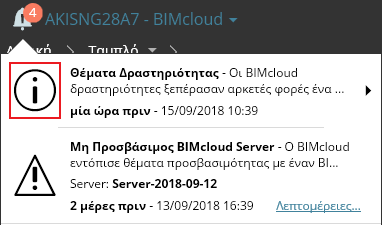 στο πτυσσόμενο μενού Ειδοποιήσεις (εικονίδιο καμπάνα) σε όλες τις σελίδες του BIMcloud Manager