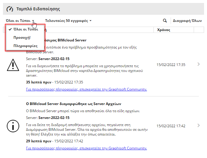 Μπορείτε να φιλτράρετε τη λίστα ανά τύπο Ειδοποίησης:
