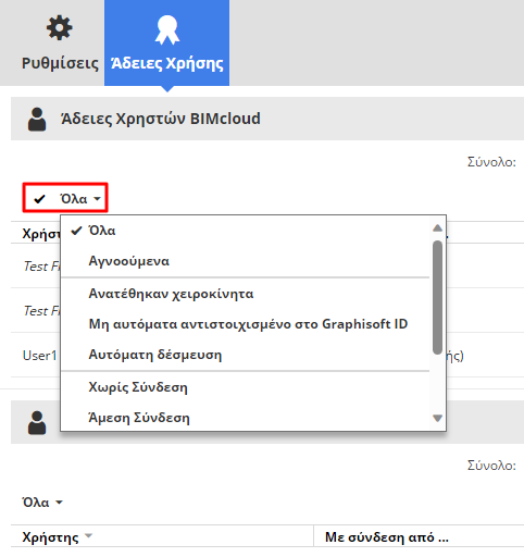 Στην καρτέλα Άδειες Χρήσης, δείτε την κατάσταση των αδειών χρήσης και των χρηστών:
