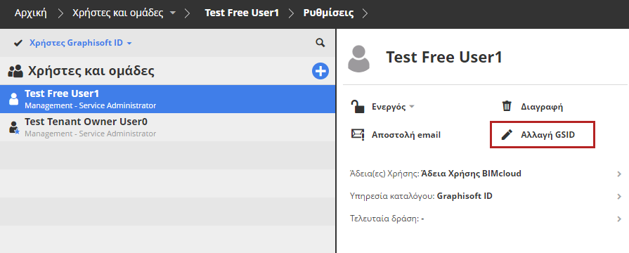 Αλλαγή λογαριασμού GSID του υπάρχοντος χρήστη BIMcloud