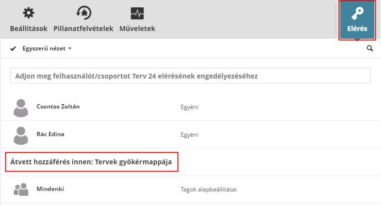 • A lista elején az adott elemhez jogosultságot kapott felhasználók/csoportok láthatók (nevüket a rendszergazda manuálisan adta hozzá – lásd: Hozzáférés engedélyezése)