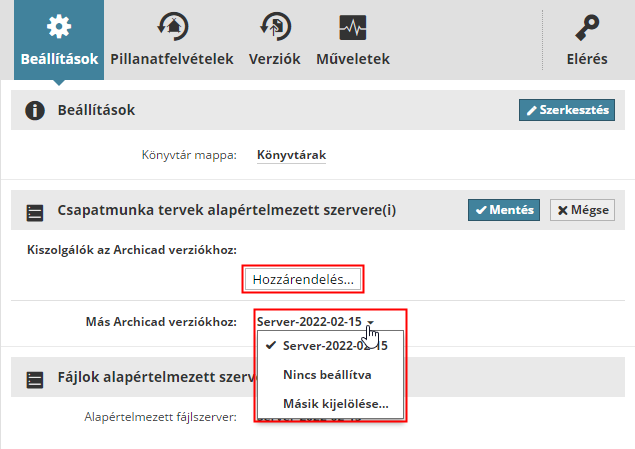 Kattintson a Hozzárendelés lehetőségre, ekkor megnyílik egy párbeszédablak, amelyben külön alapértelmezett tároló szerver állítható be az Archicad egy vagy összes változatához.