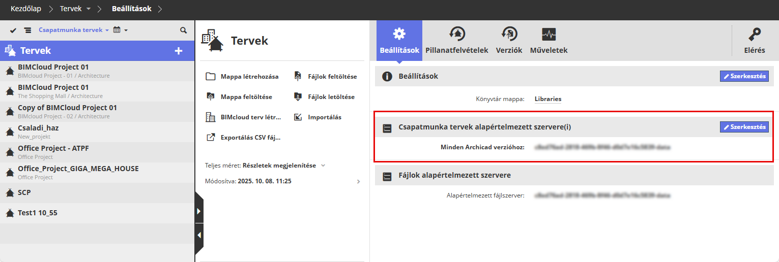 Ez a szerver itt nem módosítható. A fájlszerver módosításához (csak vezető rendszergazda esetén) nyissa meg a BIMcloud Manager Szerverek oldalát.