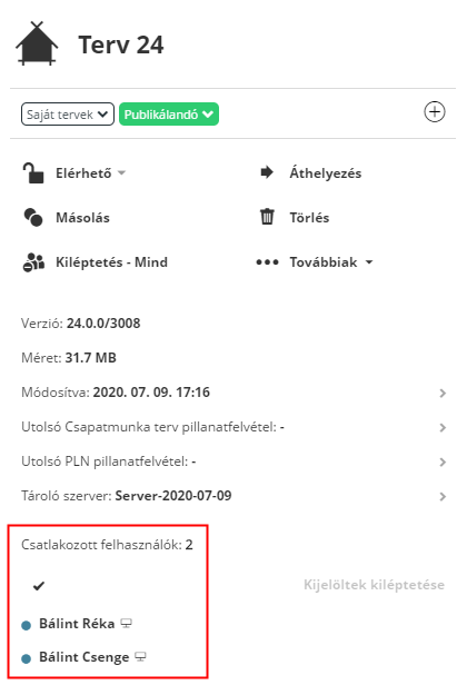 A BIMcloud Manager Tervek oldalán, válassza ki a Csapatmunka tervet. A jelenleg csatlakozott felhasználók listája. A pont színe jelzi az egyes felhasználók állapotát a terv vonatkozásában: