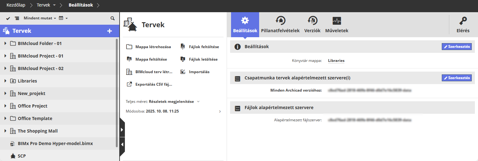 BIMcloud könyvtárak (automatikusan feltöltődnek, amikor egy Csapatmunka Tervet megosztanak)