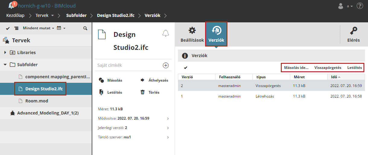 A fájlok korábbi verzióinak tárolása és visszakeresése a BIMcloudon
