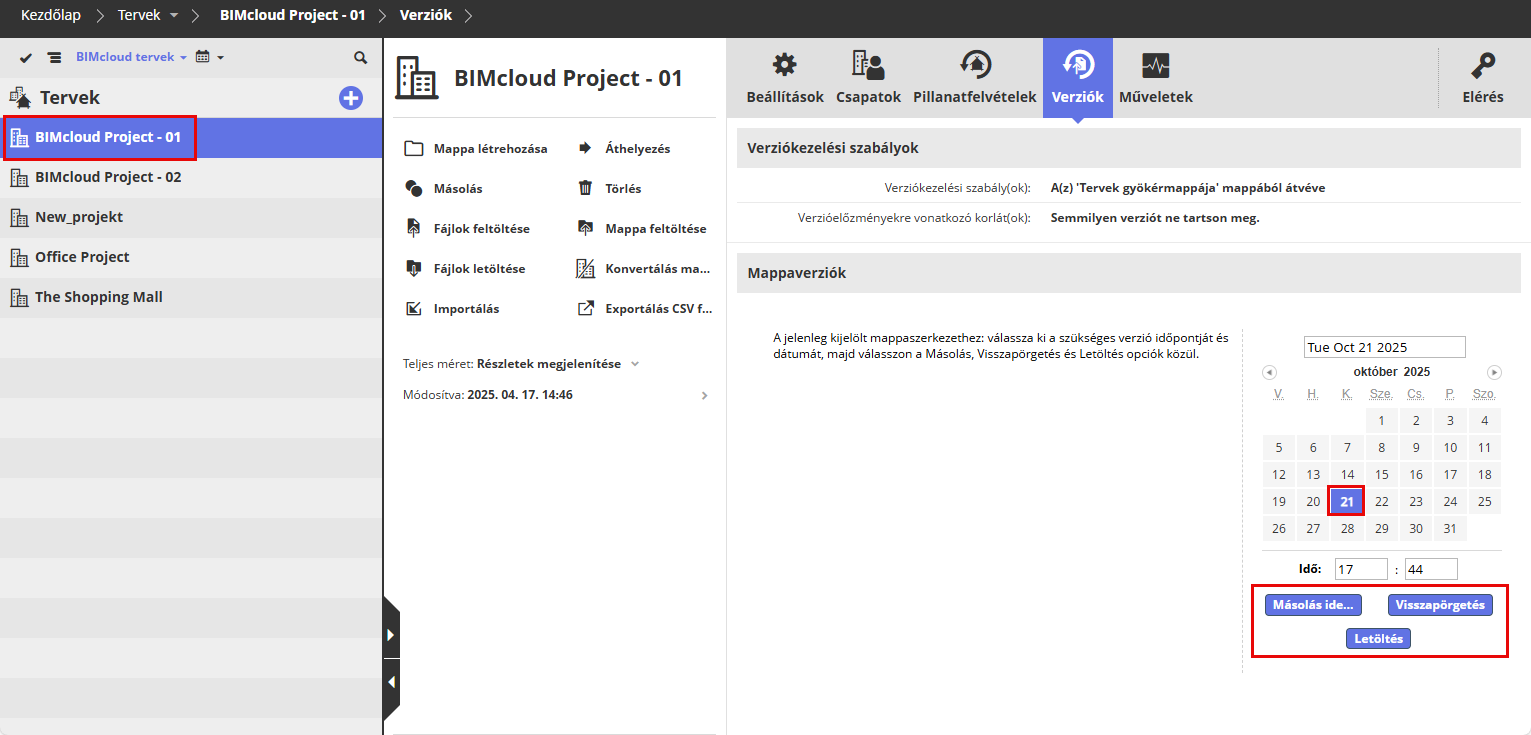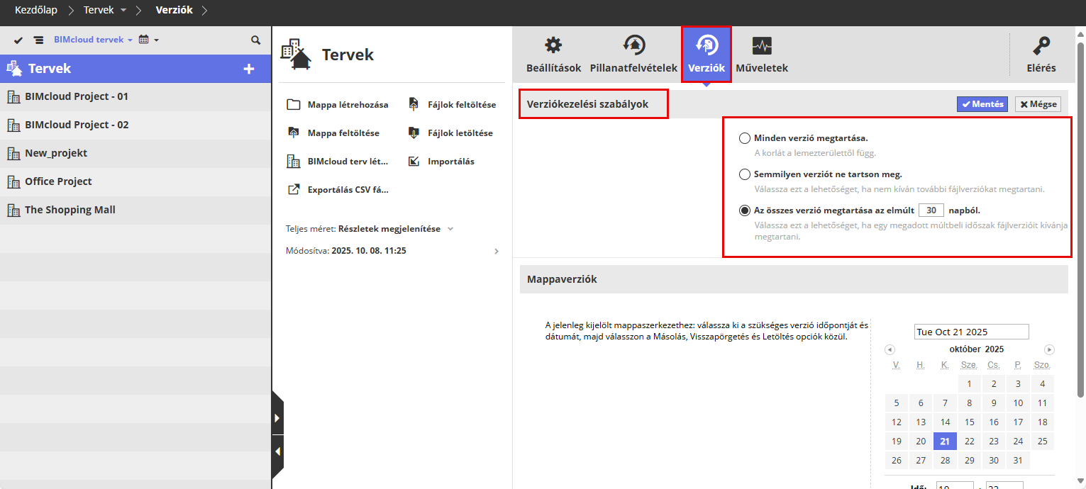 Megjegyzés: A verziókezelés csak a Tervek legfelső gyökérmappájánál állítható be. Az itt megadott beállítás vonatkozik majd a Tervek lapon megjelenő összes fájlra és mappára.Szabály kiválasztása: