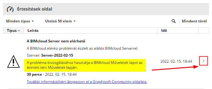 Az értesítések helyzetfüggőek, és segítségükkel egyszerűen a BIMcloud Manager megfelelő oldalára vagy egyéb releváns helyre ugorhat, ahol megtekintheti és/vagy javíthatja a problémát.