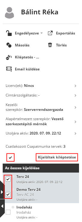 A „Kijelöltek kiléptetése” gomb aktív: kattintson rá a felhasználó kiléptetéséhez.