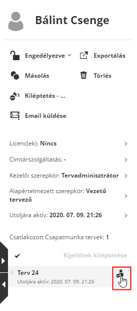 Megjegyzés: A Kiléptetés parancs azonnal teljesül, és a felhasználó nem tudja elküldeni az általa végrehajtott módosításokat. A kiléptetett felhasználó azonnal visszatérhet a tervhez mindenfajta korlátozás nélkül. Ha nem szeretné, hogy a felhasználó ismét csatlakozzon a tervhez, vonja vissza a jogosultságait a terv Elérés panelén.