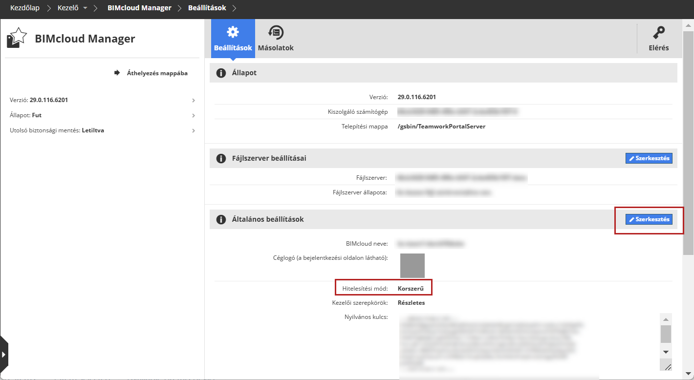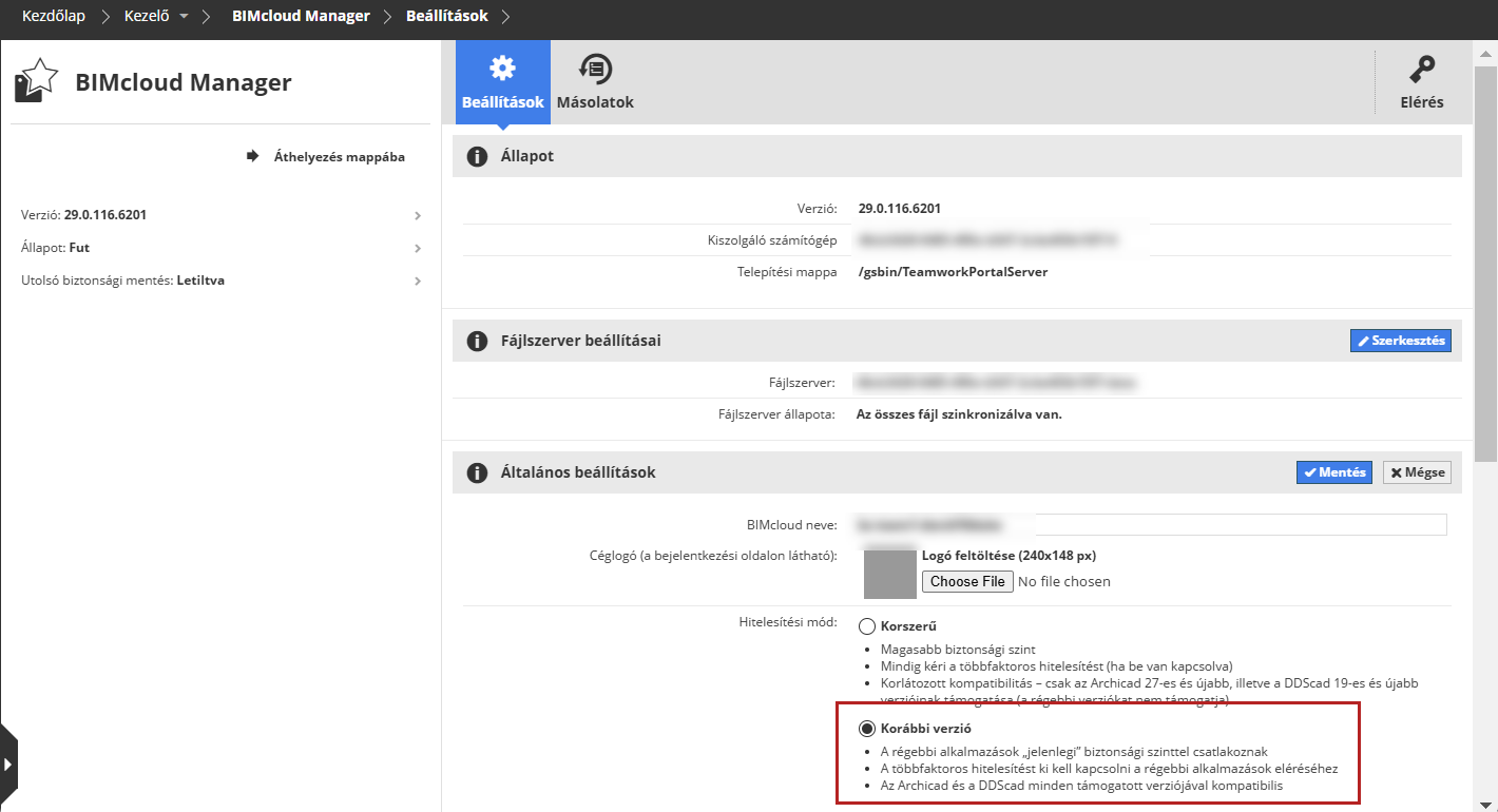 Ha régebbi verziójú tervekkel is szeretne dolgozni, kapcsolja be a „Korábbi verziójú hitelesítés” lehetőséget a BIMcloud Manager beállításainál.
