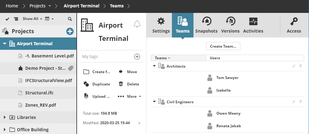 A BIMcloud Project functions as a special kind of folder. For example, your BIMcloud Project can include Teamwork Projects, files of any format, and sub-folders in any hierarchy. You can assign a unique Team of users to your BIMcloud Project and/or to its sub-items.