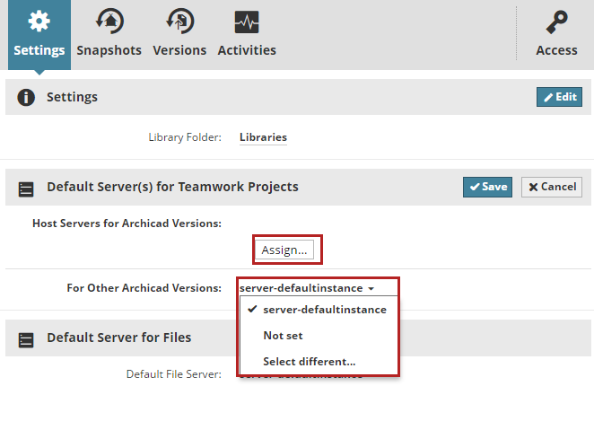 Click Assign to open a dialog to set separate default host servers for any or all different versions of Archicad.