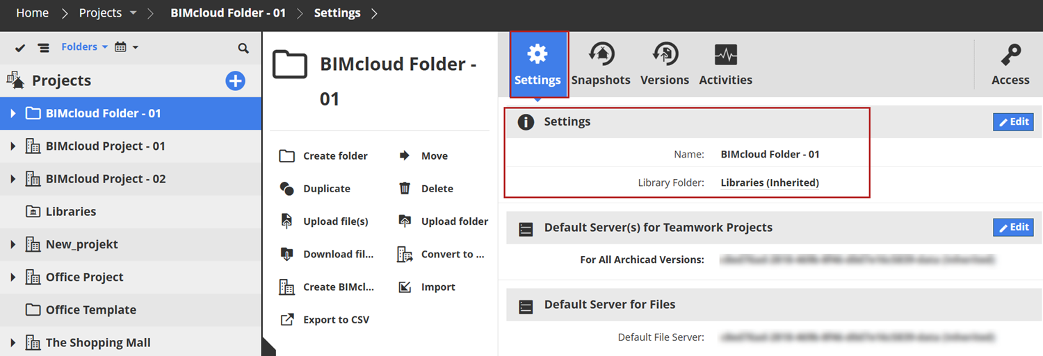 Select a project, library, folder or file. Use the Settings tab to edit its settings.