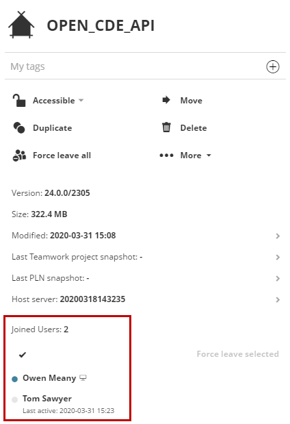 On the Projects page of BIMcloud Manager, select a Teamwork project. Currently joined users are listed. The color of the dot indicates each user’s status for this project: