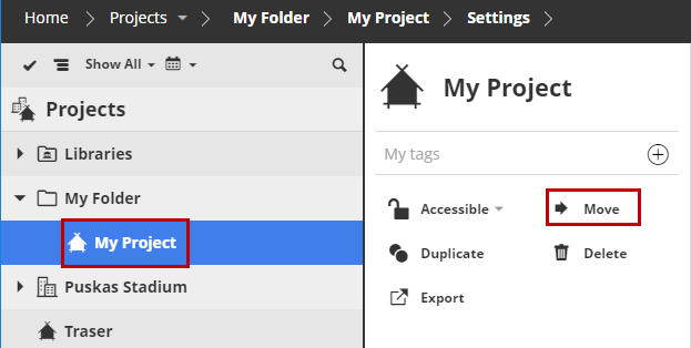 The Move function is available on the BIMcloud Projects page for all items except the Project Root.