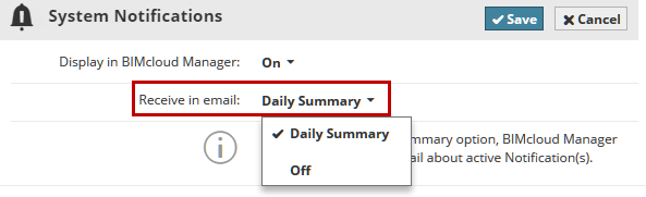 Off: System Notifications will not pop up anywhere in the BIMcloud Manager interface.