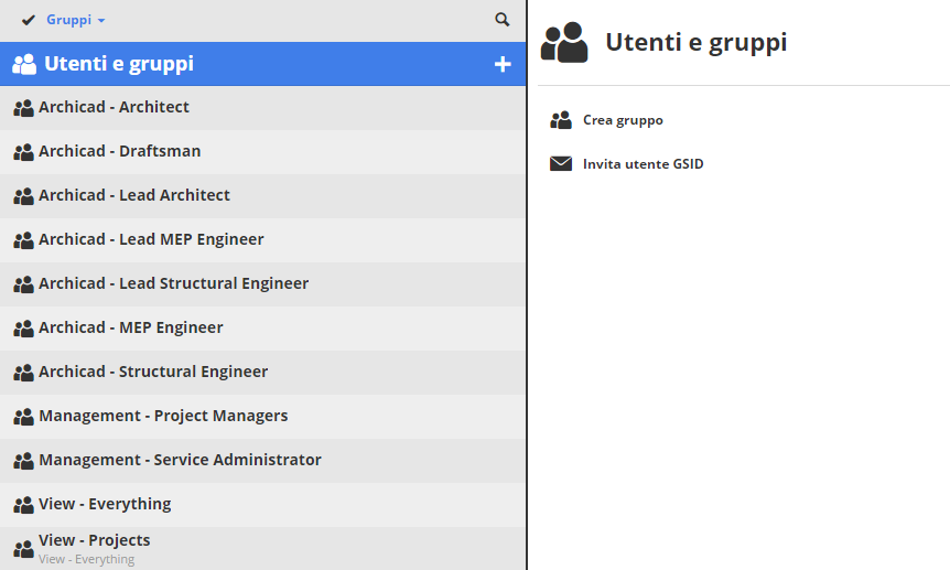 I gruppi “Amministrazione” forniscono i permessi per il BIMcloud, per gestire progetti, librerie e utenti.