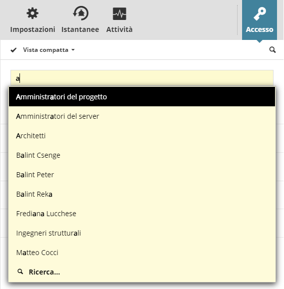 Aprire il pannello Accesso e iniziare a digitare il nome di chi può accedervi (utente o gruppo), o fare clic su Ricerca. Per concedere l'accesso a tutti gli utenti, utilizzare il gruppo speciale Tutti.