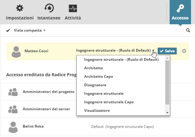 - Scegliere un ruolo per l'utente o il gruppo – questo definisce il cosa potrà fare la persona con l'elemento selezionato. (Ciascun ruolo è costituito da un insieme di permessi. Definire e modificare i ruoli nella pagina Ruoli.) È possibile: