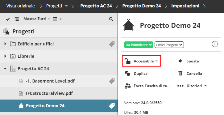 Nella pagina del Progetto di BIMcloud, lo stato del progetto selezionato indica: