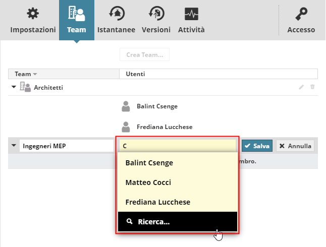 - Immettere il nome di un team (ad es. "Ingegneri MEP"), quindi fare clic su Crea