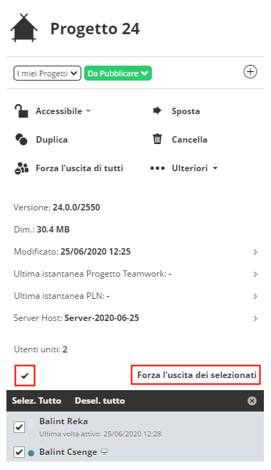 Selezionare gli utenti che volete che escano dal progetto: il pulsante “Forza l'uscita dei selezionati” diventa abilitato.