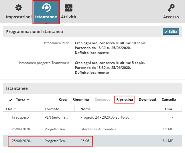 Dall'elenco delle istantanee, selezionare un'istantanea progetto Teamwork o un'istantanea Libreria.
