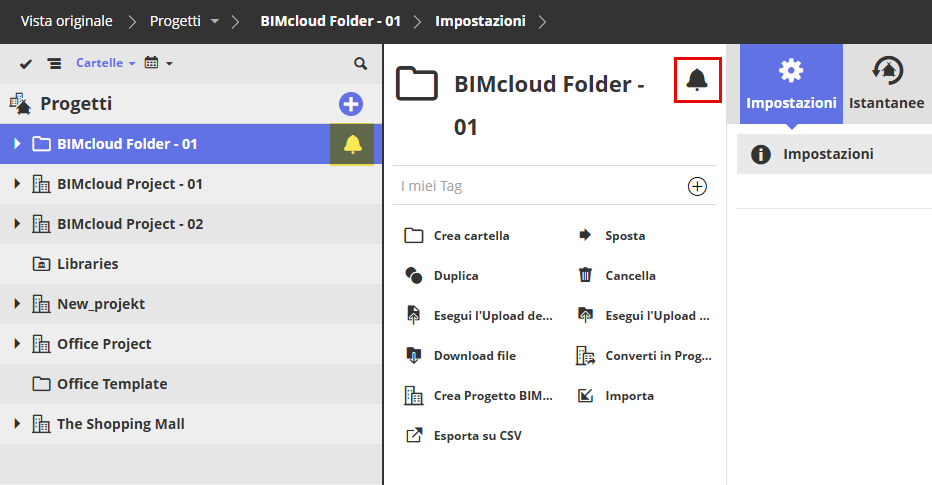 Tenere traccia delle modifiche apportate ai file e alle cartelle su BIMcloud iscrivendo questi elementi nella pagina Progetti di BIMcloud Manager. La "Cartella" può essere una normale cartella, un progetto BIMcloud o una cartella di Libreria.