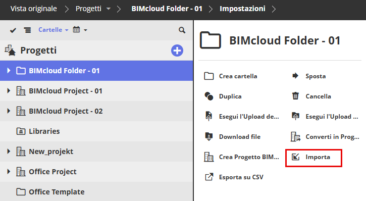 È possibile importare un file di progetto Teamwork (estensione .BIMProject) o un file di libreria (.BIMLibrary) in una cartella selezionata su BIMcloud.