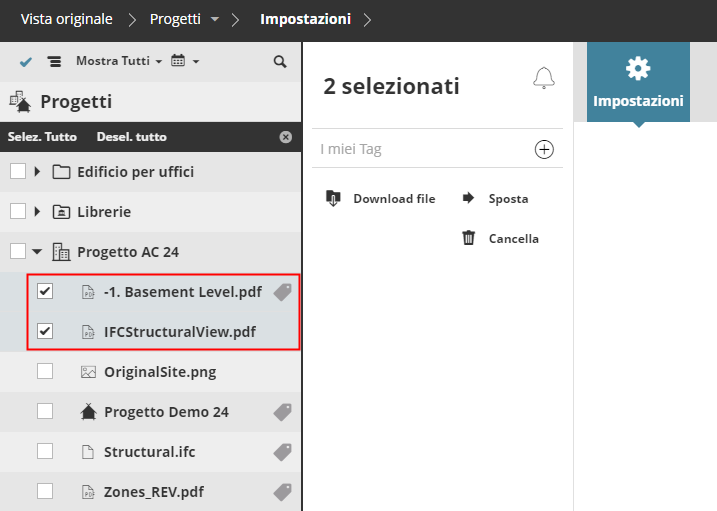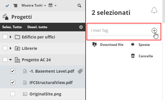 Gli elementi taggabili sono tutti quelli elencati nella pagina Progetti del BIMcloud: Progetti Teamwork, Progetti BIMcloud, Librerie, Cartelle e file caricati.