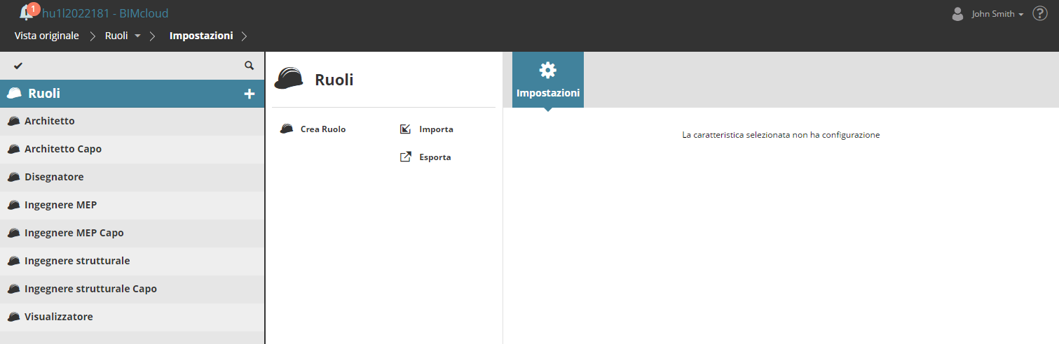 L'amministratore può utilizzare i ruoli per limitare le funzioni disponibili per un determinato utente in modo da prevenire danni accidentali o modifiche indesiderate sul progetto. Ciascun utente può avere Ruoli diversi per i diversi progetti. È possibile creare anche un ruolo di sola visione, per consentire alle persone di unirsi al progetto senza poterlo modificare in alcun modo.