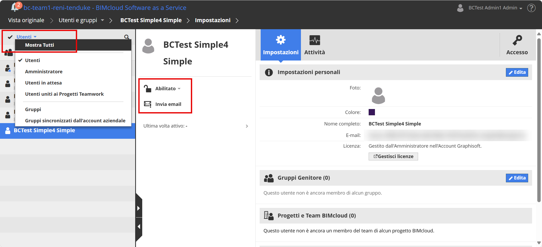 Dalla pagina Utenti e gruppi di BIMcloud Manager è possibile visualizzare e filtrare l'elenco degli utenti e creare gruppi di utenti. Le altre funzioni disponibili variano secondo quello che si è selezionato nel Navigatore (utente o gruppo utenti):