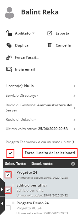 Selezionare i progetti da cui forzare l'uscita dell'utente.