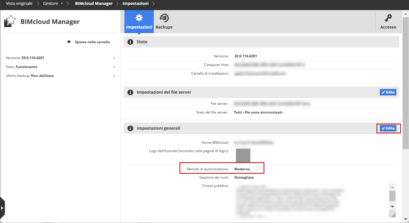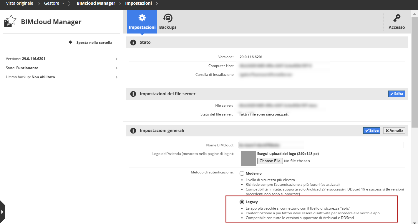 Se desiderate lavorare anche con progetti da versioni precedenti, attivate “Legacy” nelle impostazioni di BIMcloud Manager.