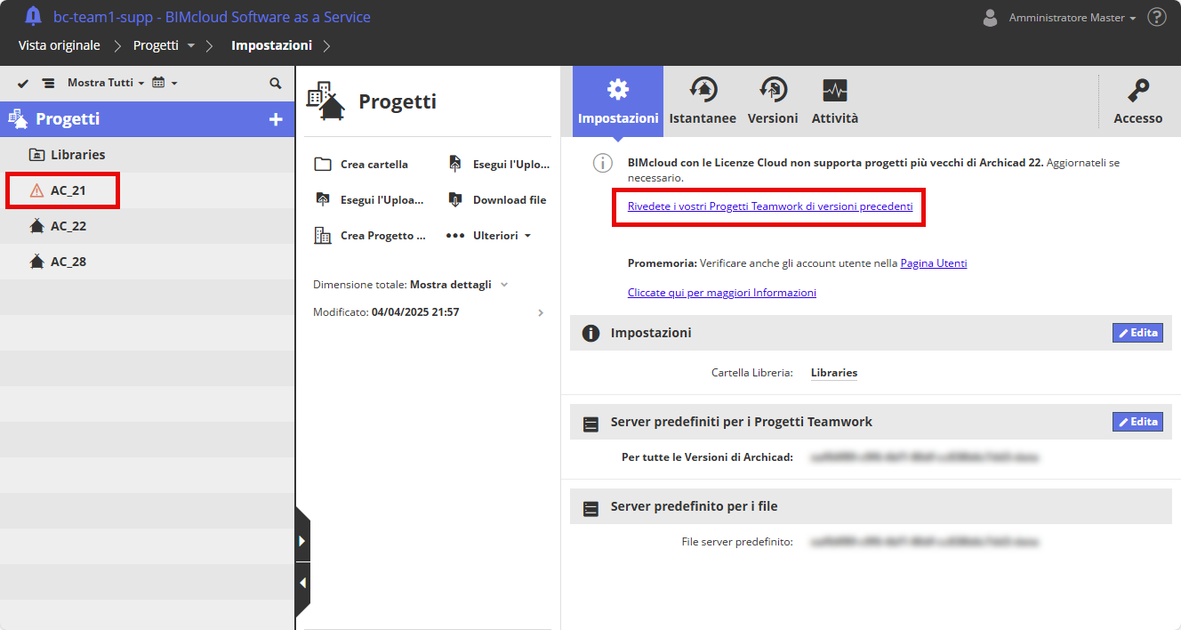 BIMcloud SaaS con licenze cloud supporta solo progetti di Teamwork versione 22 o successiva. Pertanto, prima di ricollegare il vostro BIMcloud al nuovo webshop, è necessario eseguire la migrazione di tutti i vecchi progetti Teamwork ad Archicad 22 o successivo.