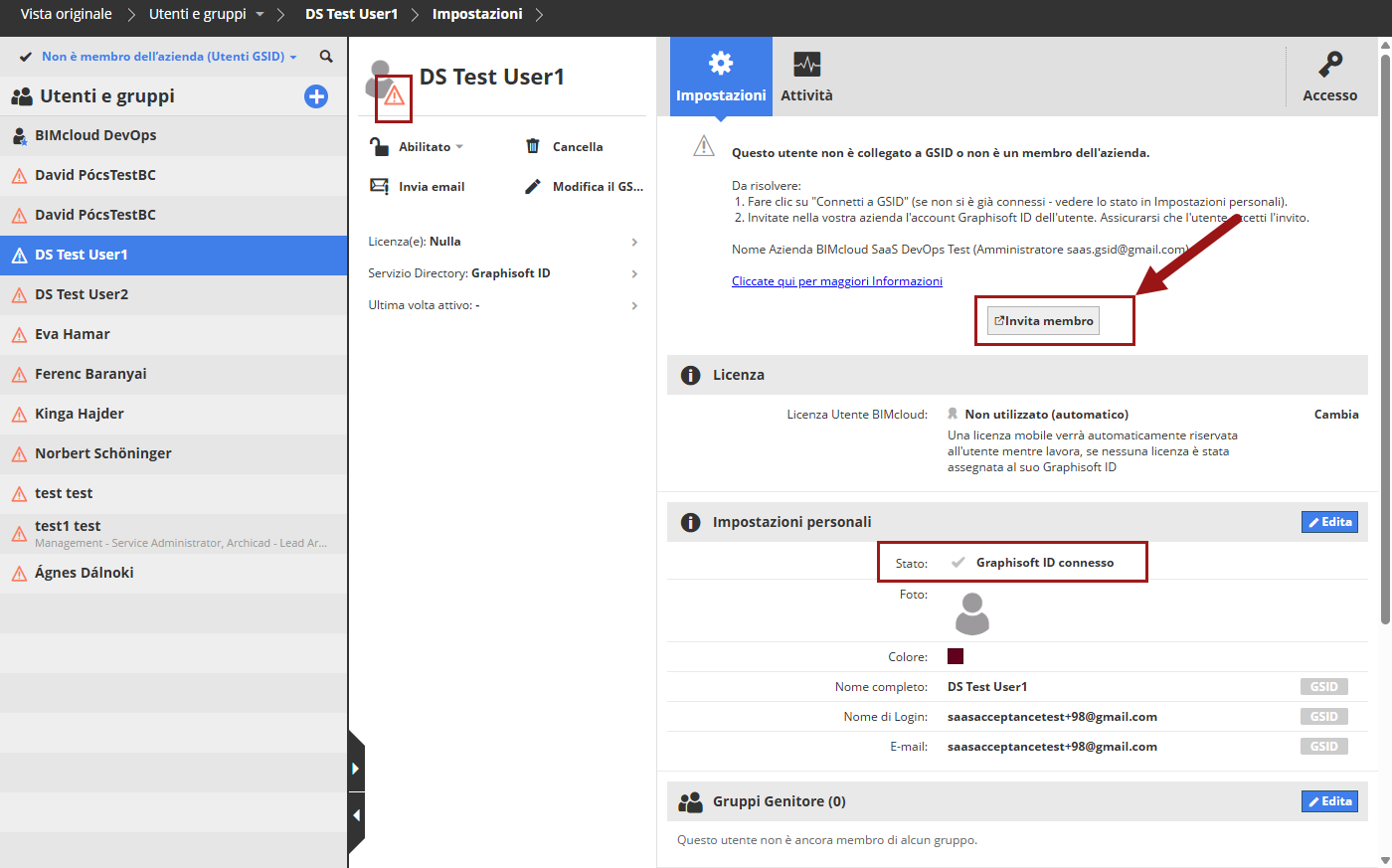 Tutti gli utenti di BIMcloud devono essere invitati a far parte dell'account aziendale. Per gli utenti che non sono ancora membri: fare clic su "Invita membro" per aprire il proprio account Graphisoft Company e inviare gli inviti.