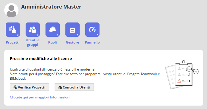 Potrete gestire i vostri utenti e le licenze cloud nel vostro account aziendale (invece che localmente nell'interfaccia BIMcloud)