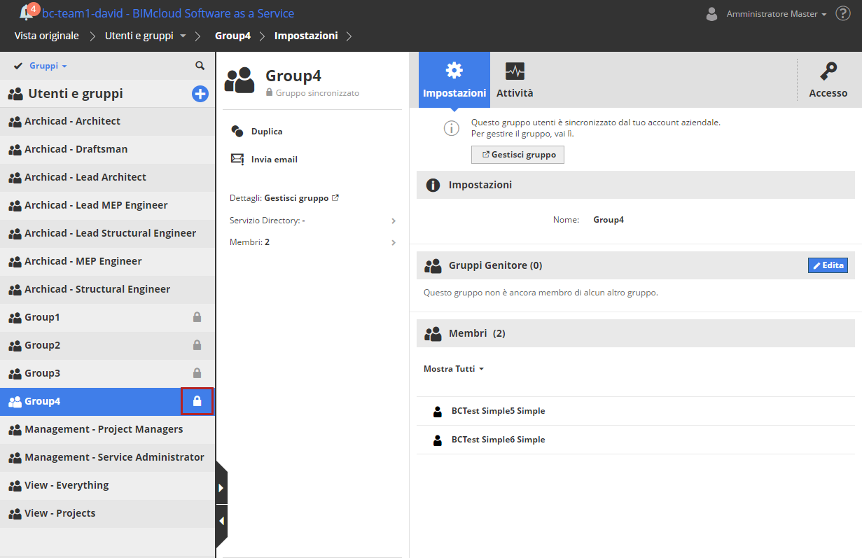 - Non è possibile cancellare, modificare o esportare un gruppo sincronizzato dal BIMcloud. Per modificare un gruppo sincronizzato, utilizzare l'account aziendale